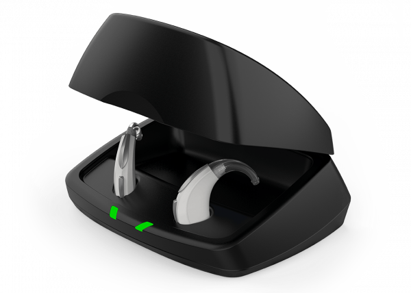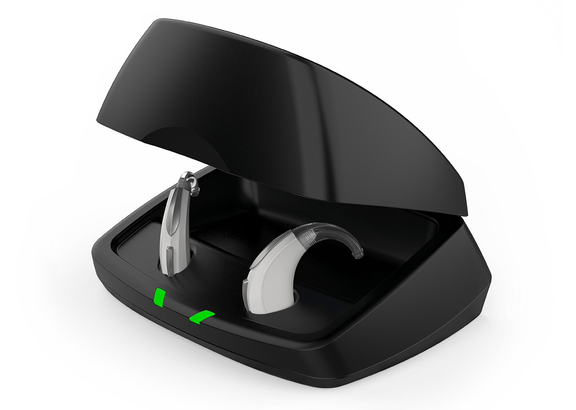 The Premium Standard Charger operates as a portable charging station and case for standard lithium-ion rechargeable hearing aids. The charger is equipped with LED lights to indicate charging status for both hearing aids and charger. Compatible with Evolv Al & Livio range of products.